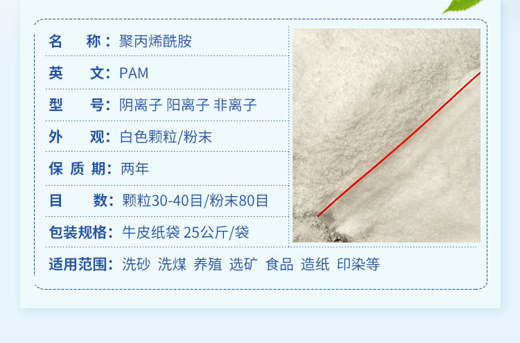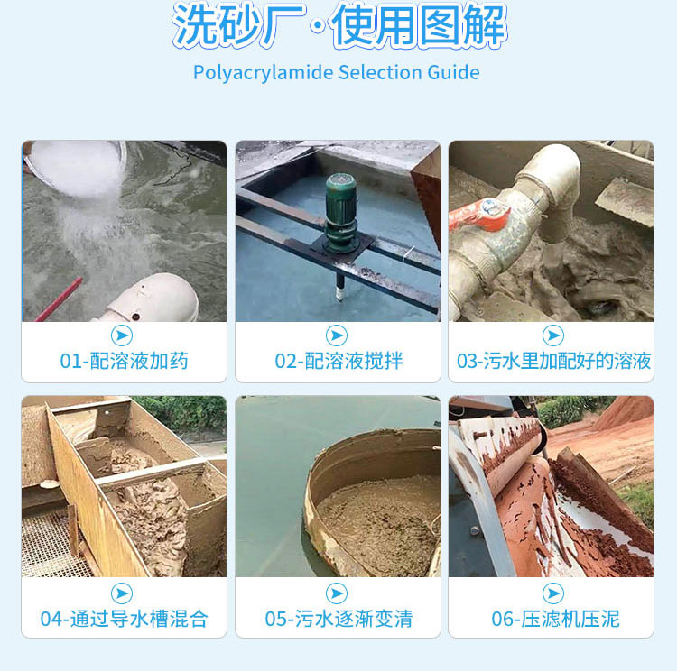 2、 添加少量非離子聚丙烯酰胺,即可受到極大的絮凝效果。一般只需添加0.01~10ppm(0.01~10g/m3),即可充分發(fā)揮作用。